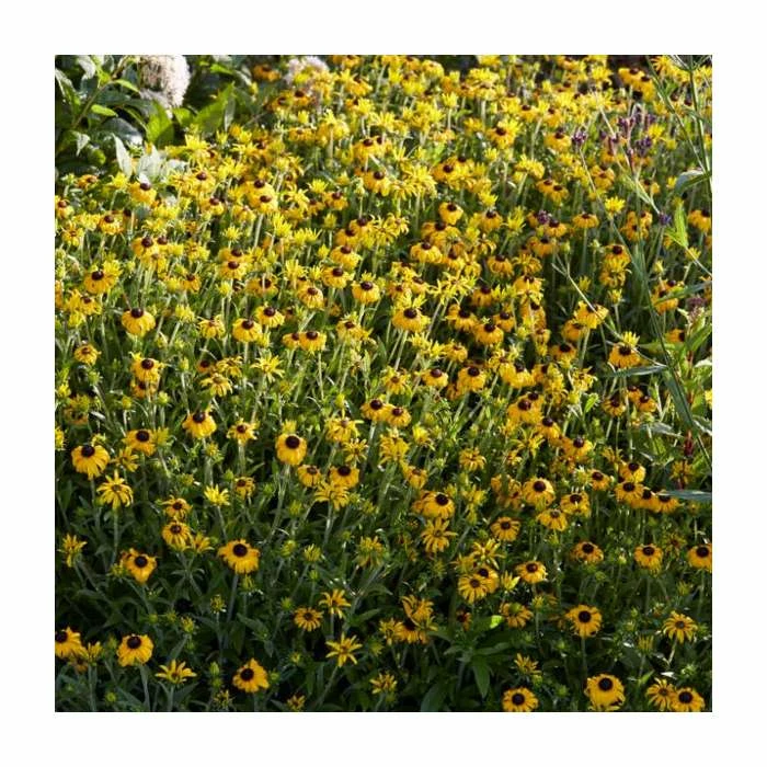 A compact Rudbeckia forming golden flowers with contrasting black centres